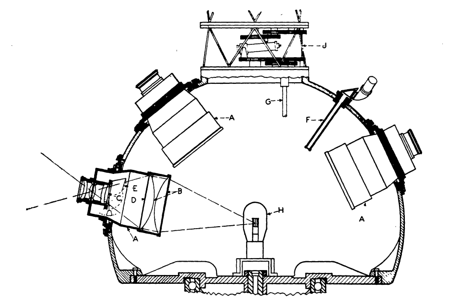 Plate I shows the finished projector (complete except for the lunar mechanism in the upper planet cage). Thirty projector units for star fields are arranged about the two hemispheres ; the planet cages are mounted on the poles, and their common axis is perpendicular to the ecliptic. Two separate projection units, mounted on the ends of the planet cages, fill in the blind spots on the star hemispheres and complete the array of thirty-two star fields. The geometrical arrangement of the mosaic of projected stars follows the pattern used by the Zeiss designers, that is, the thirty-two facets of a truncated icosahedron are used to represent the complete celestial sphere.